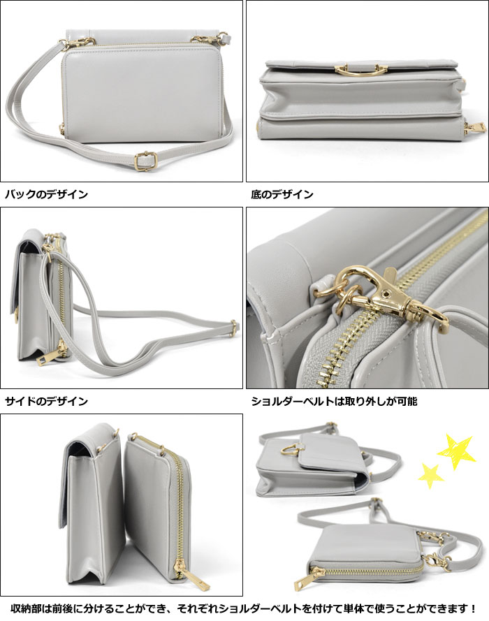 ■ スマホや小物を入れて身軽にお出かけしたい時に便利です! ■ フロントのフラップ付きの収納部分と財布は分かれているので、それぞれショルダーベルトをつけて単体で使うことができます。
