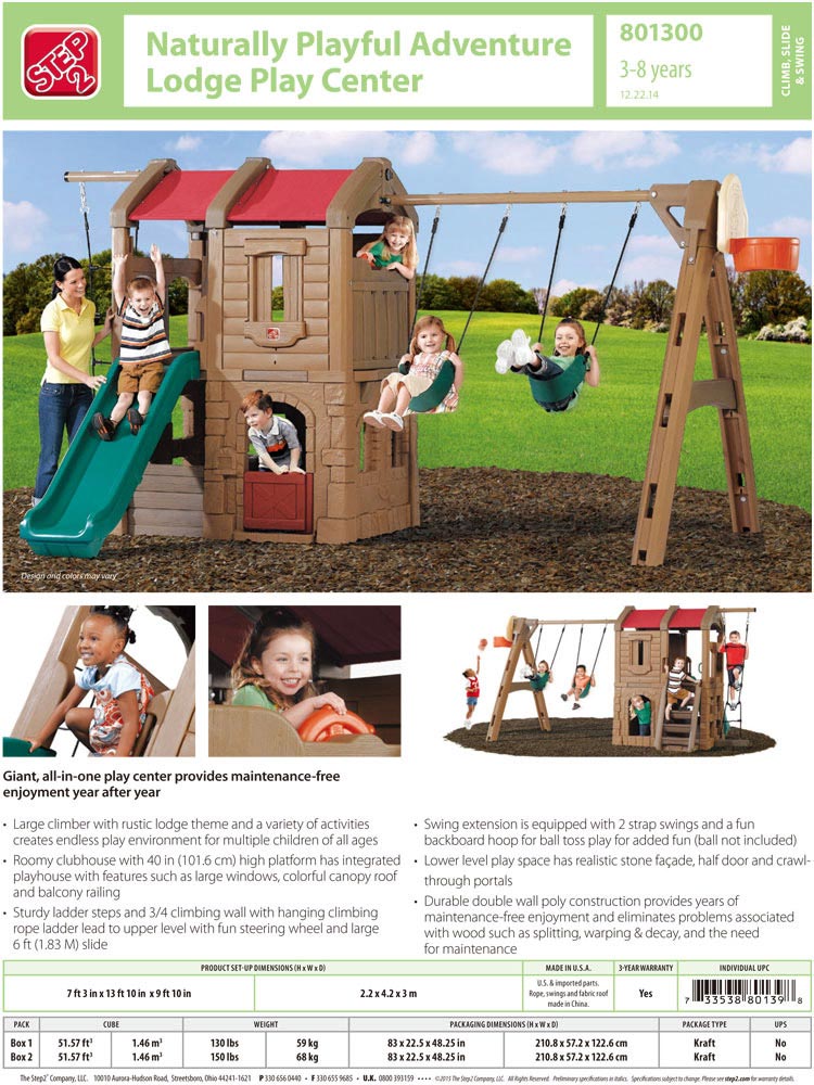 商品説明 メーカー STEP2 商品名 Naturally Playful Adventure Lodge Play Center 型番 801300 サイズ 本体: H220 x W420 x D300 cm BOX: H210.8 x W57.2 x D122.6 cm x 2箱 重さ 129 kg 対象年齢 3歳から8歳(メーカー参照) 安全基準 ヨーロッパ規格適合(EN-71) 生産国 Made in USA. / パーツ Made in China. 仕様 ・クラブハウスには2階建てのクライミングと隠れ遊び場があります。